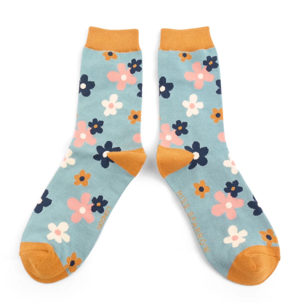 Miss Sparrow Damen Bambussocken – Blumen Motiv – Blau – Größe 36-41
